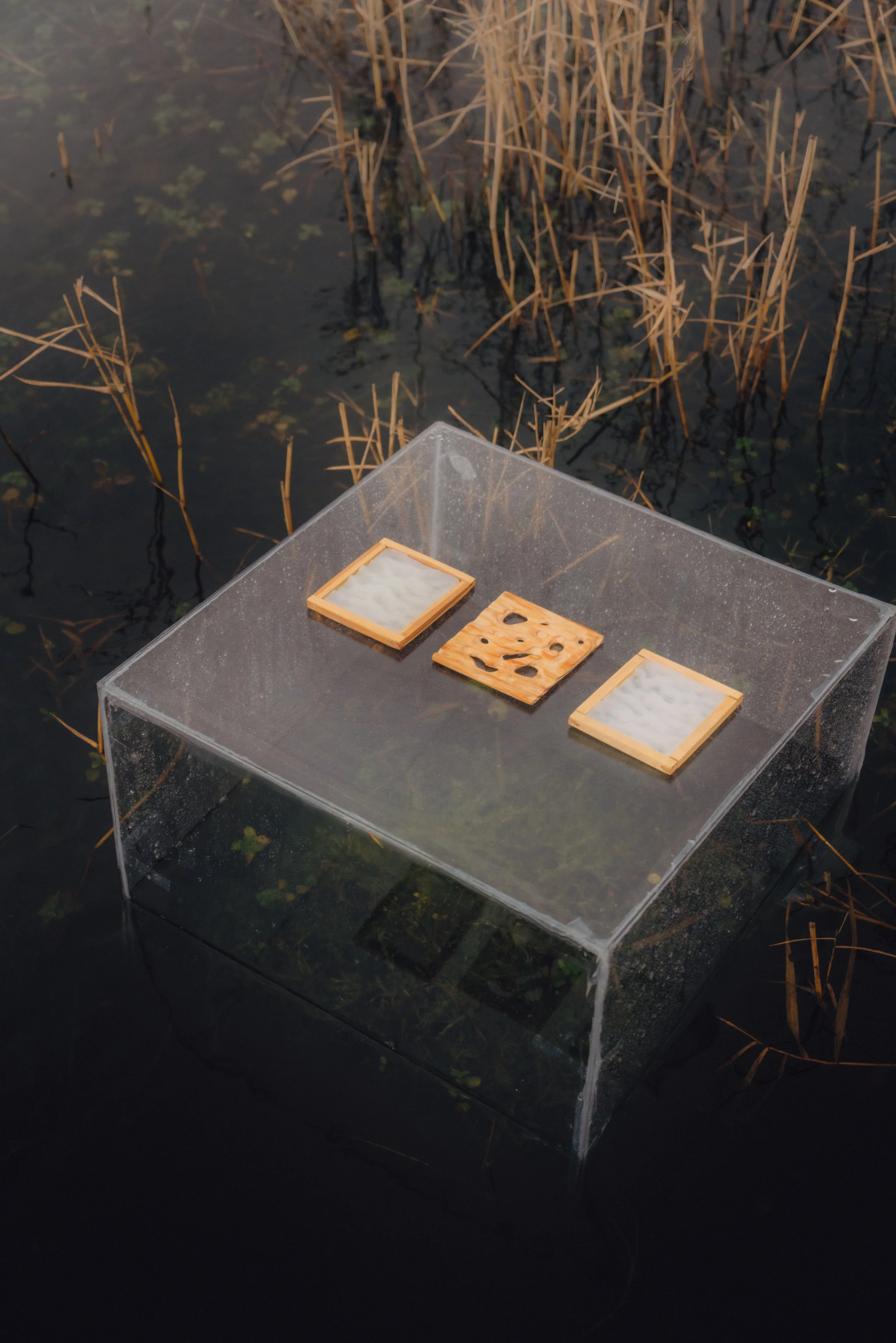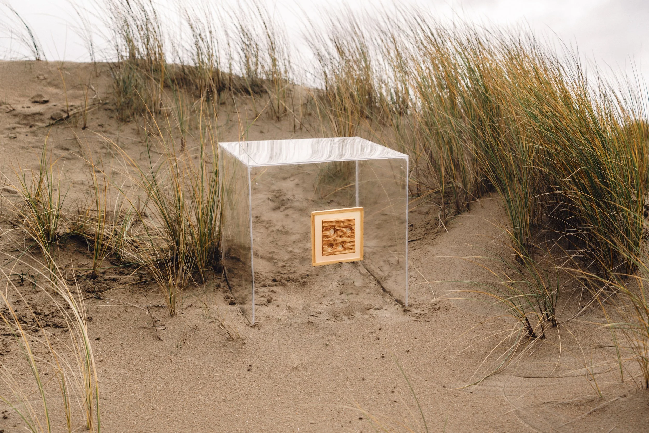 embroidery, glass beads, metal and solder on silk in wooden frame
